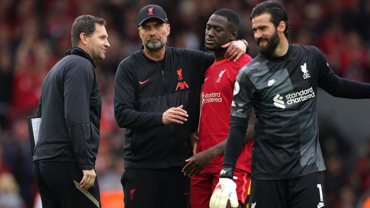 Liverpool manager Jurgen Klopp (second left) consoles Ibrahima Konate during the Premier League match at Anfield, Liverpool. Peter Byrne/PA Wire.