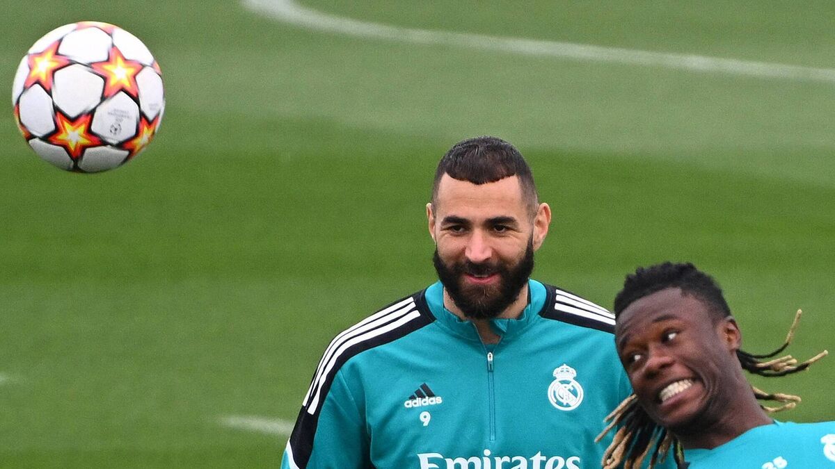 Real Madrid's French forward Karim Benzema (L) and Real Madrid's French midfielder Eduardo Camavinga attend a training session at the Ciudad Real Madrid in the Madrid's suburb of Valdebebas during the club's Media Day on May 24, 2022 ahead of their UEFA Champions League final match against Liverpool. Photo by GABRIEL BOUYS/AFP via Getty Images)