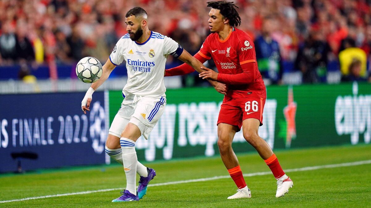 Real Madrid's Karim Benzema holds off Liverpool's Trent Alexander-Arnold during the UEFA Champions League Final at the Stade de France, Paris. Adam Davy/PA Wire.