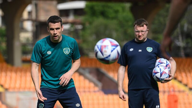 Eyes always on the ball: Seamus Coleman and Andrew Morrissey, STATSports analyst, during a Republic of Ireland training session at Vazgen Sargsyan Republican Stadium in Yerevan, Armenia. Pic: Stephen McCarthy/Sportsfile