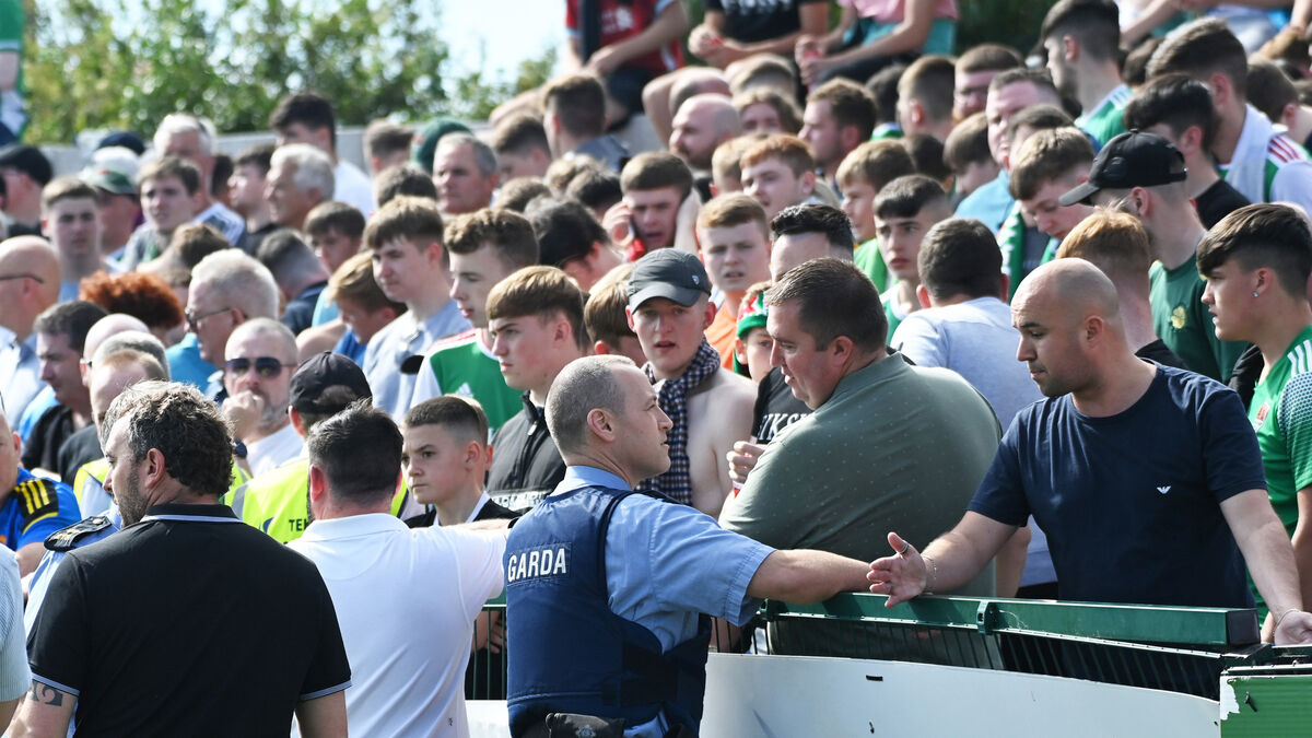 INVESTIGATION: Gardai and Cork City's head of security Robbie Kelleher speaking with Cork City fans after a fence gave way during the FAI cup against Cobh Ramblers at St Colman's park. Picture; Eddie O'Hare