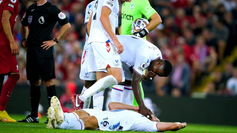 PRONE: Crystal Palace's Joachim Andersen lies on the ground after being fouled by Liverpool's Darwin Nunez during the Premier League match at Anfield. Pic: Peter Byrne/PA Wire