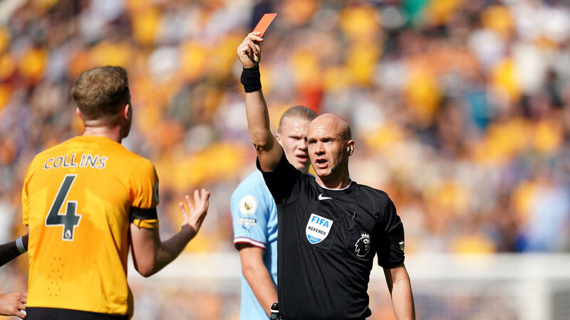 MARCHING ORDERS: Wolverhampton Wanderers' Nathan Collins is shown a red card by referee Anthony Taylor.