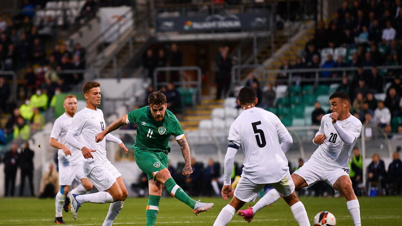Constant threat: Aaron Connolly of Republic of Ireland shoots at goal during the UEFA European U21 Championship play-off first leg match between Republic of Ireland and Israel at Tallaght Stadium in Dublin. Pic: Eóin Noonan/Sportsfile