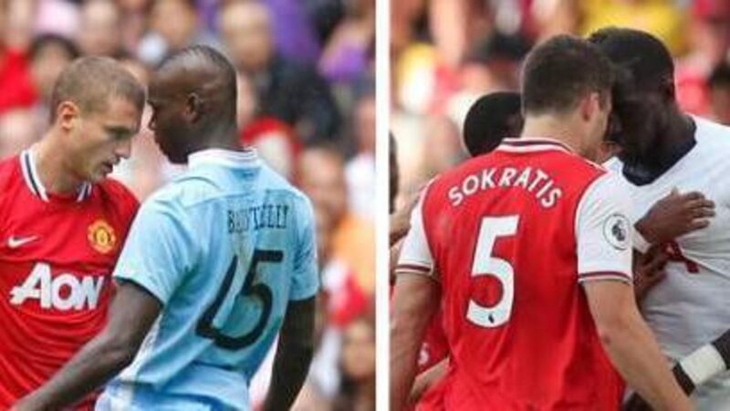 Two tribes going to war: Nemanja Vidic and Mario Balotelli clash on Manchester derby day in Manchester 11 years ago, right, while more recently in 2019, Moussa Sissoko of Tottenham Hotspur and Sokratis Papastathopoulos of Arsenal clash in North London. Pics: Getty Images
