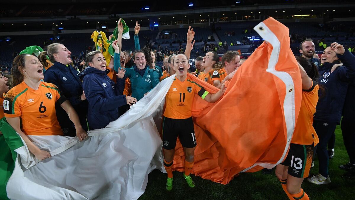 FINALLY THERE: Republic of Ireland players and staff celebrate after the FIFA Women's World Cup 2023 Play-off match between Scotland and Republic of Ireland at Hampden Park in Glasgow, Scotland. Pic: Stephen McCarthy/Sportsfile