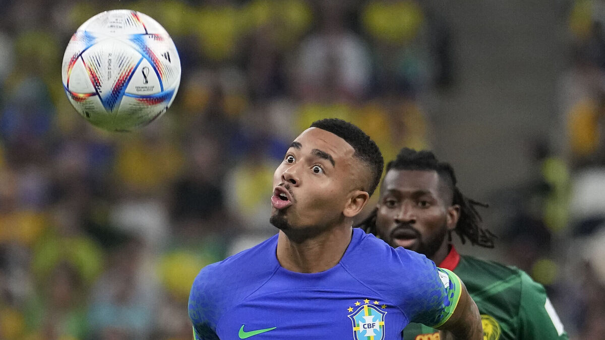 INJURY BLOW: Brazil's Gabriel Jesus, front, and Cameroon's Andre-Frank Zambo Anguissa. Pic: AP Photo/Moises Castillo