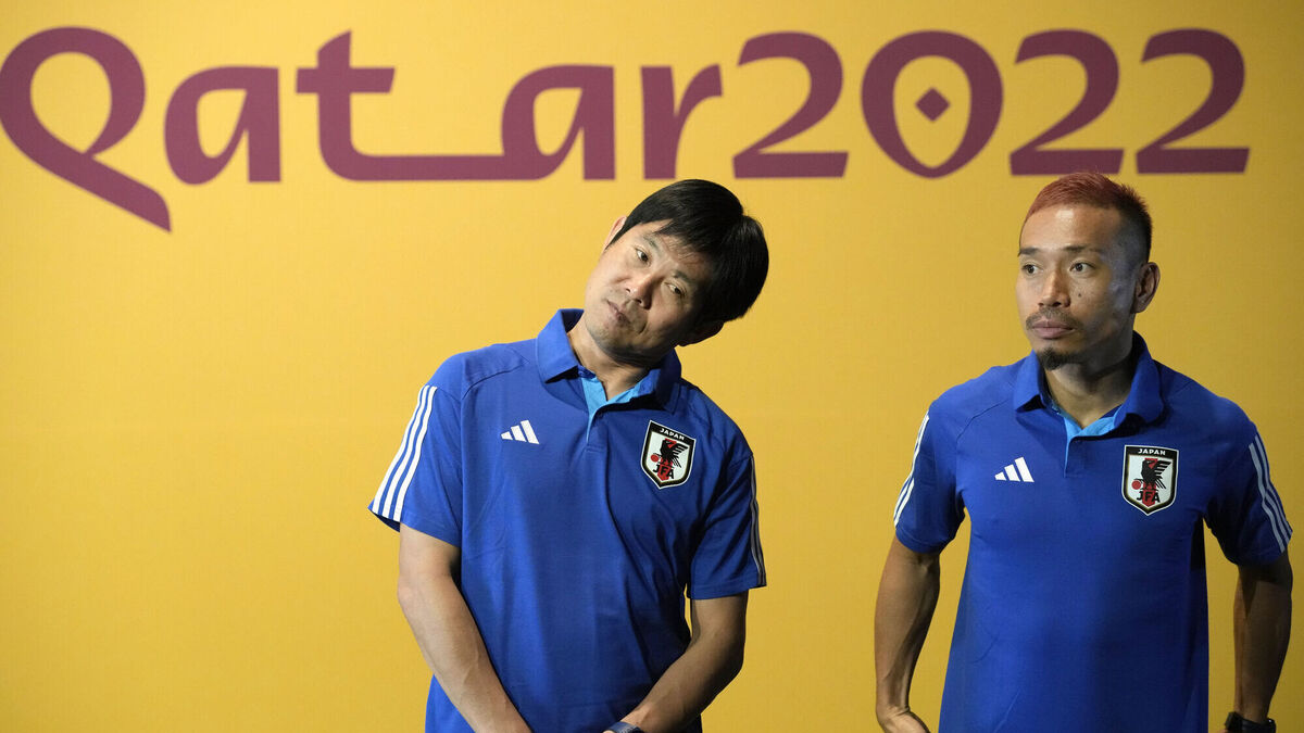REACHING NEW HEIGHTS: Japan's head coach Hajime Moriyasu, left, and Yuto Nagatomo, right, prepare to pose for photographers. Pic: AP Photo/Eugene Hoshiko