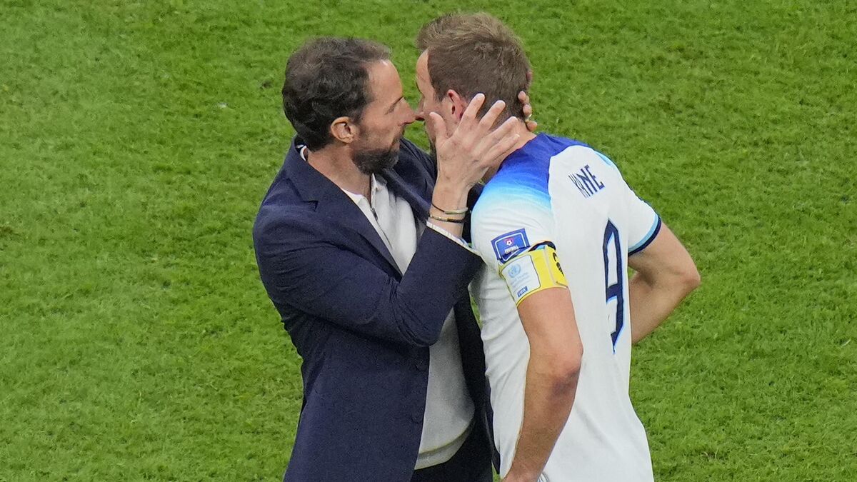 CONSOLING: England's head coach Gareth Southgate embraces Harry Kane after the World Cup quarter-final against France, at the Al Bayt Stadium in Al Khor, Qatar. Pic: AP Photo/Hassan Ammar