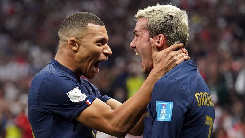 GETTING BETTER WITH AGE: Antoine Griezmann (right) celebrates France's second goal against England at the Al Bayt Stadium in Al Khor, Qatar. Pic: Mike Egerton/PA Wire