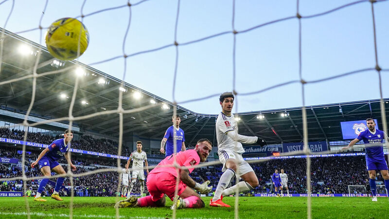 SONNY DAY: Leeds United's Sonny Perkins scores their side's second goal of the game at Cardiff City Stadium. Picture: David Davies/PA Wire