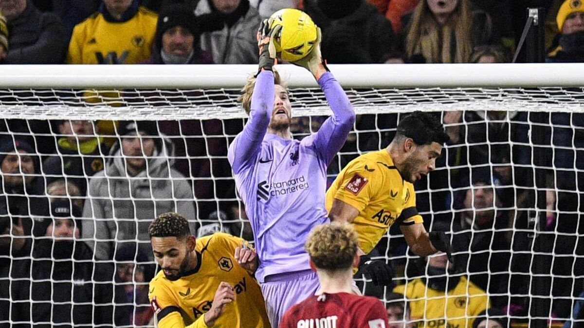 MARK: Liverpool's Irish goalkeeper Caoimhín Kelleher commands his penalty despite pressure from Wolves players this week. Picture: Oli SCARFF / AFP