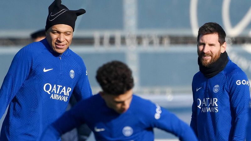 BIG GUNS: Paris Saint-Germain's French forward Kylian Mbappe (L) and Argentine teammate Lionel Messi in training on Monday. Pic: Franck Fife/AFP via Getty Images