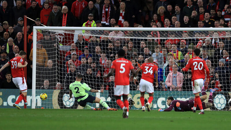 BIG IMPACT: Nottingham Forest's Chris Wood (left) scores the equalising goal to level at 1-1 during the Premier League match at the City Ground, Nottingham. Pic: Bradley Collyer/PA Wire