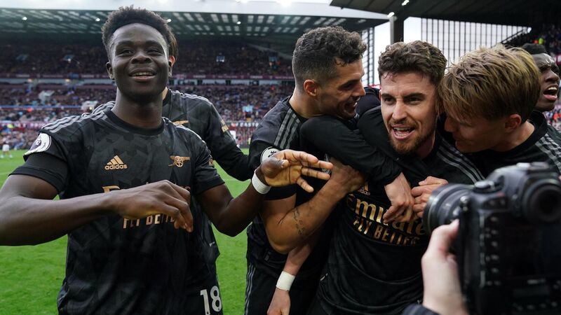 BACK ON TOP: Arsenal's Jorginho celebrates his sides third goal, an own goal by Aston Villa goalkeeper Emiliano Martinez during the Premier League match at Villa Park, Birmingham. Pic: Nick Potts/PA Wire