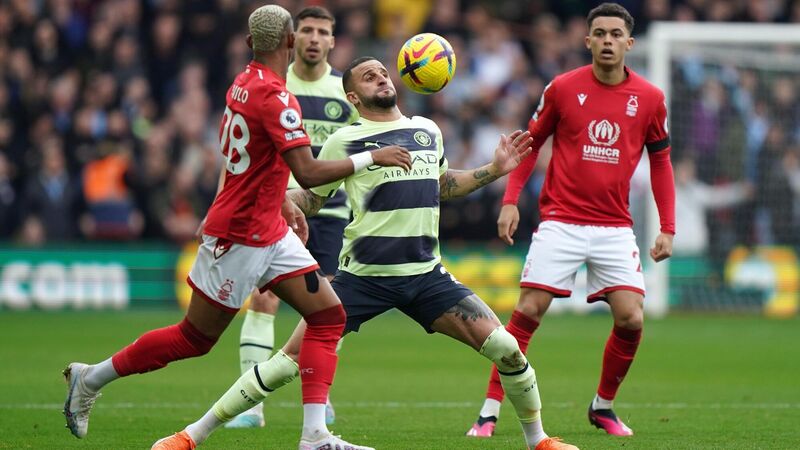 DROPPED POINTS: Manchester City’s Kyle Walker (centre) and Nottingham Forest’s Danilo (left) battle for the ball during the Premier League match at the City Ground, Nottingham.