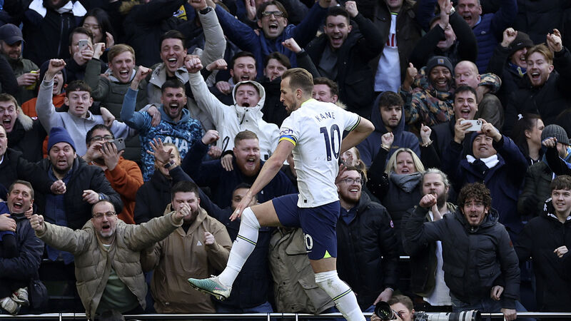 Tottenham's Harry Kane celebrates scoring his side's second goal. Picture: AP Photo/Ian Walton
