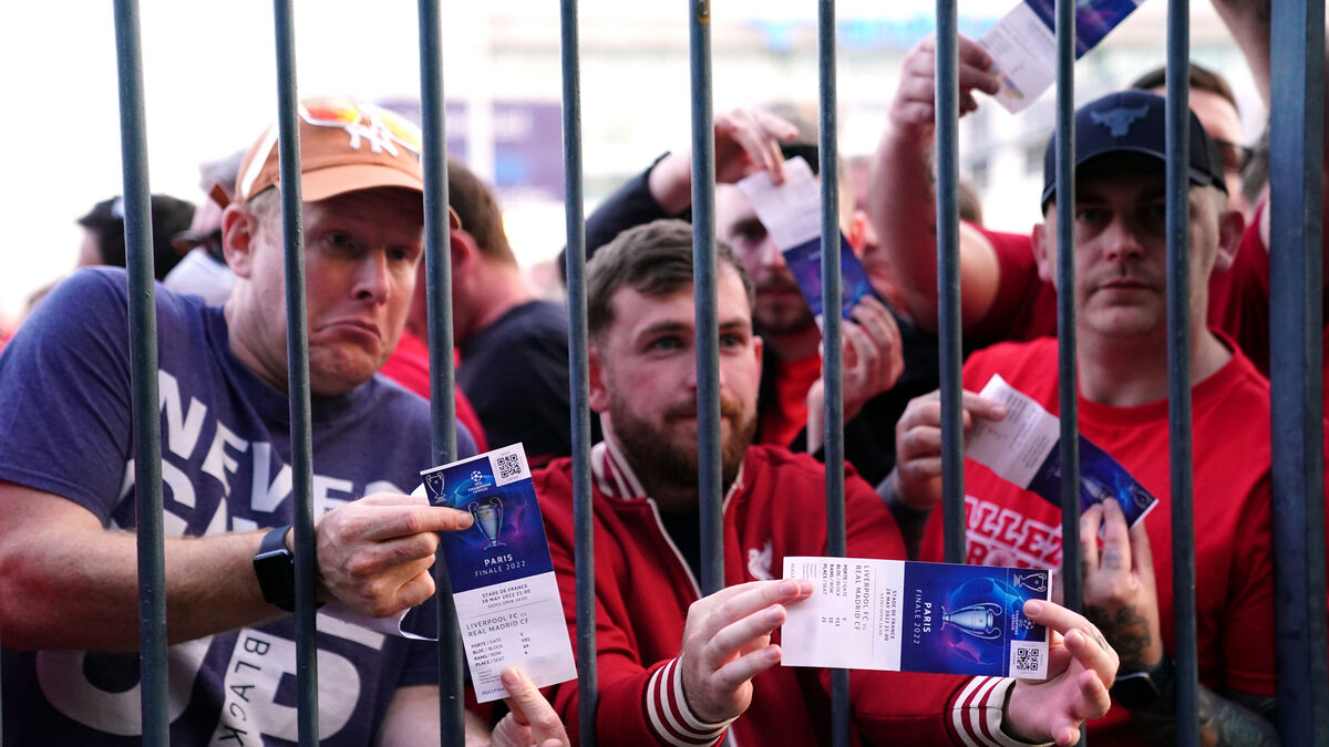 REFUND: Liverpool fans stuck outside the ground show their match tickets during the UEFA Champions League Final at the Stade de France, Paris. Picture date: Saturday May 28, 2022.
