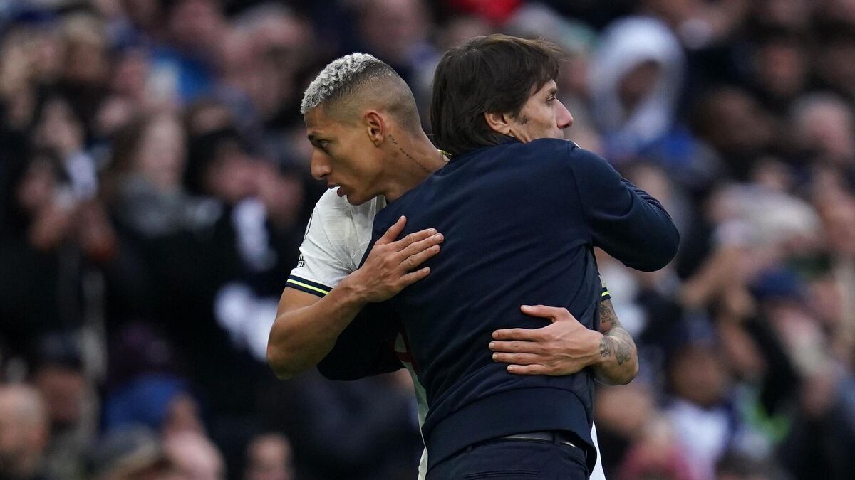 HUG IT OUT: Tottenham Hotspur manager Antonio Conte greets Richarlison as he is substituted during the Premier League match at the Tottenham Hotspur Stadium. Pic: John Walton/PA Wire