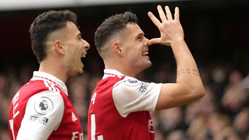 FUNNY FACE: Arsenal's Granit Xhaka celebrates scoring his side's thirsd goal on Sunday with Gabriel Martinell
