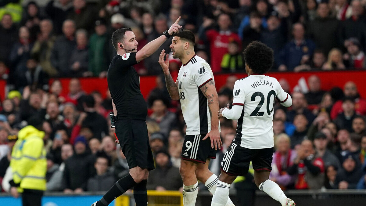 LOST THE PLOT: Fulham's Aleksandar Mitrovic (centre) is sent off. Pic: Martin Rickett/PA Wire.