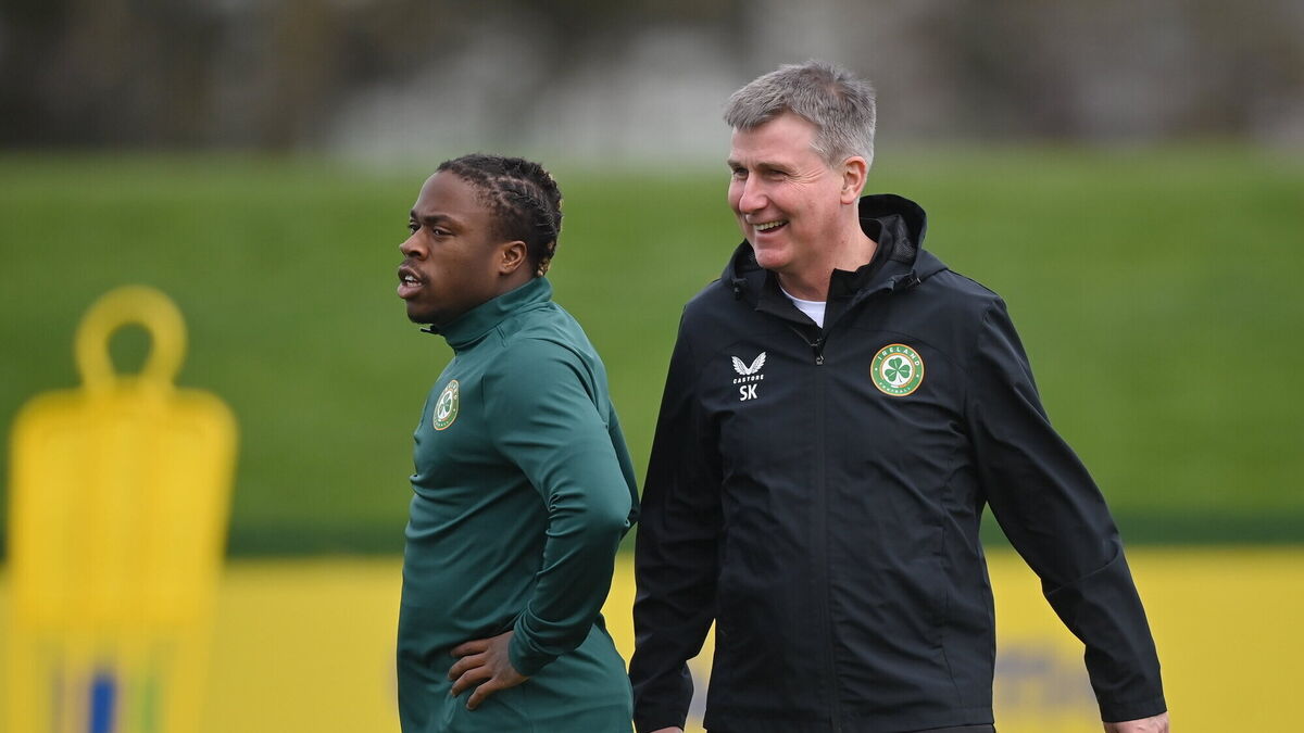 'EVERY GAME IS IMPORTANT': Manager Stephen Kenny and Michael Obafemi during a Republic of Ireland training session at the FAI National Training Centre in Abbotstown. Pic: Stephen McCarthy/Sportsfile
