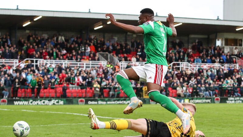 Tunde Owolabi of Cork City is tackled by John Alan McGrath of St Patrick's Athletic on Friday night. Picture: Michael P Ryan/Sportsfile
