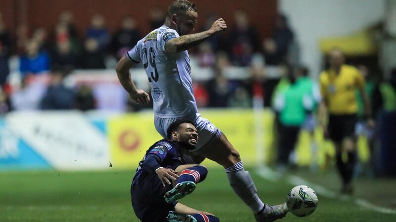 EXPECT FIREWORKS: Shels' Patrick Barrett fouls Jake Mulraney of Pats'. Pic: ©INPHO/Evan Treacy