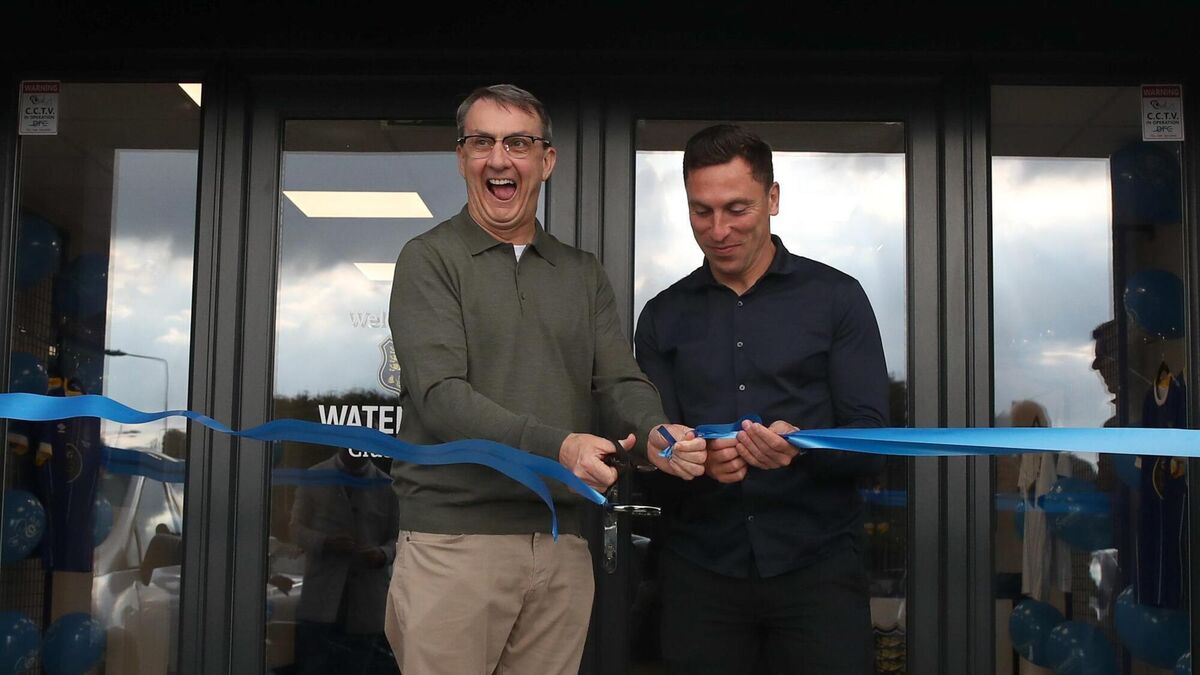 OPENING UP: Waterford owner Andy Pilley, left, and Fleetwood Town head coach Scott Brown at the opening of the Waterford FC official club store and matchday ticket office before the SSE Airtricity Men's First Division match between Waterford and Cobh Ramblers at the RSC in Waterford. Photo by Michael P Ryan/Sportsfile