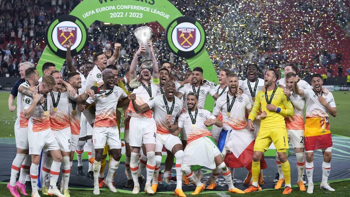 CHAMPIONS: West Ham players celebrates with the trophy after winning the Europa Conference League final. Pic: AP Photo/Darko Bandic