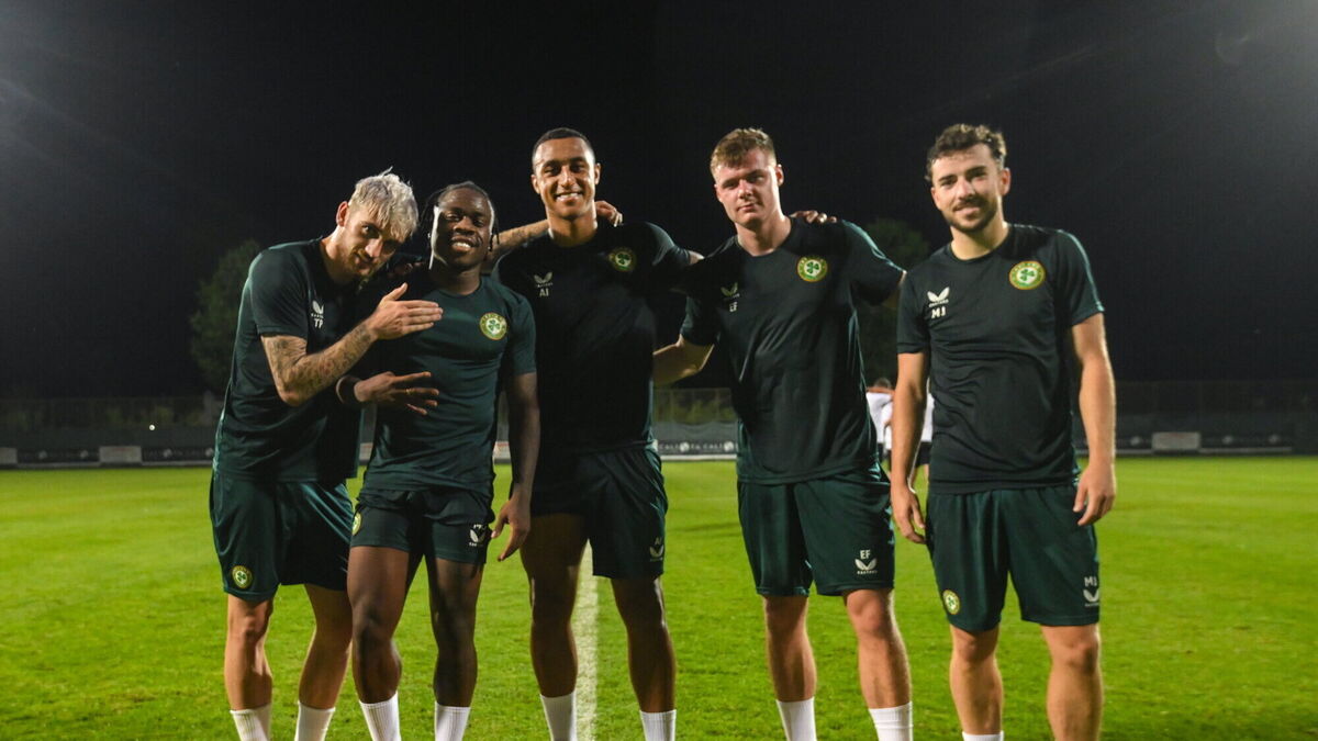 FORWARD THINKING: Republic of Ireland players, from left, Troy Parrott, Michael Obafemi, Adam Idah, Evan Ferguson and Mikey Johnston after a training session at Calista Sports Centre in Antalya, Turkey. Pic: Stephen McCarthy/Sportsfile