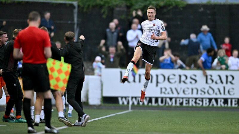 JUMPING FOR JOY: Daniel Kelly of Dundalk celebrates after scoring during the SSE Airtricity Men's Premier Division match against St Patrick's Athletic at Oriel Park. Pic: Sam Barnes/Sportsfile