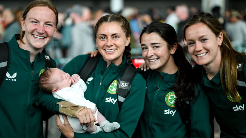 FAREWELL: Republic of Ireland players, from left, Courtney Brosnan, Sinead Farrelly, Marissa Sheva and Heather Payne, with Harry Byrne, age 5 weeks, from Dublin city, at Dublin Airport ahead of the Republic of Ireland's flight to Australia. Pic: Stephen McCarthy/Sportsfile