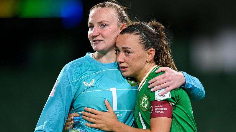 Republic of Ireland captain Katie McCabe, right, and goalkeeper Courtney Brosnan after their side's defeat in the FIFA Women's World Cup 2023 Group B match between Republic of Ireland and Canada at Perth Rectangular Stadium in Perth, Australia. Photo by Stephen McCarthy/Sportsfile