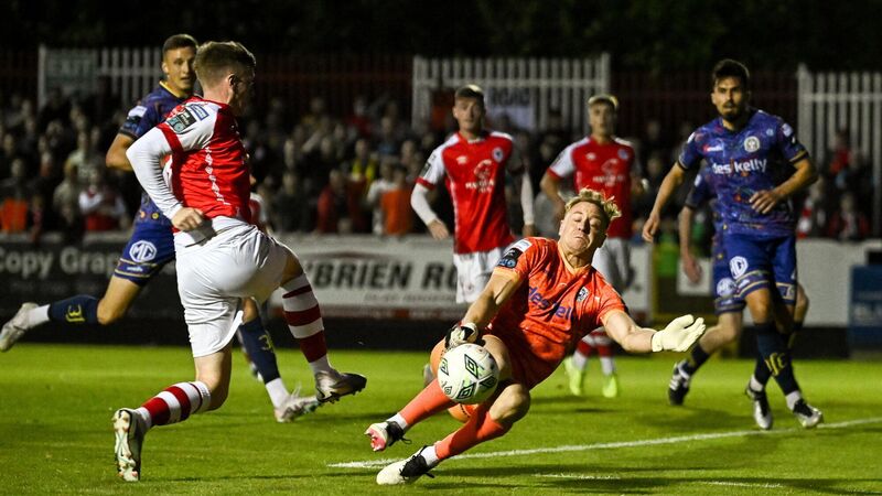 LAST DITCH: Bohemians goalkeeper James Talbot in action against Chris Forrester of St Patrick's Athletic during the SSE Airtricity Men's Premier Division match at Richmond Park. Pic: EĂłin Noonan/Sportsfile