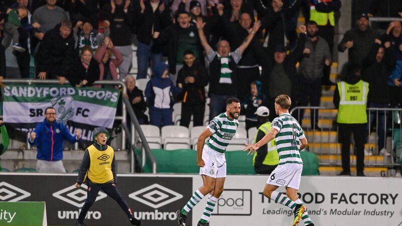WINNER: Roberto Lopes of Shamrock Rovers, left, celebrates with teammate Daniel Cleary after scoring. Pic: Seb Daly/Sportsfile