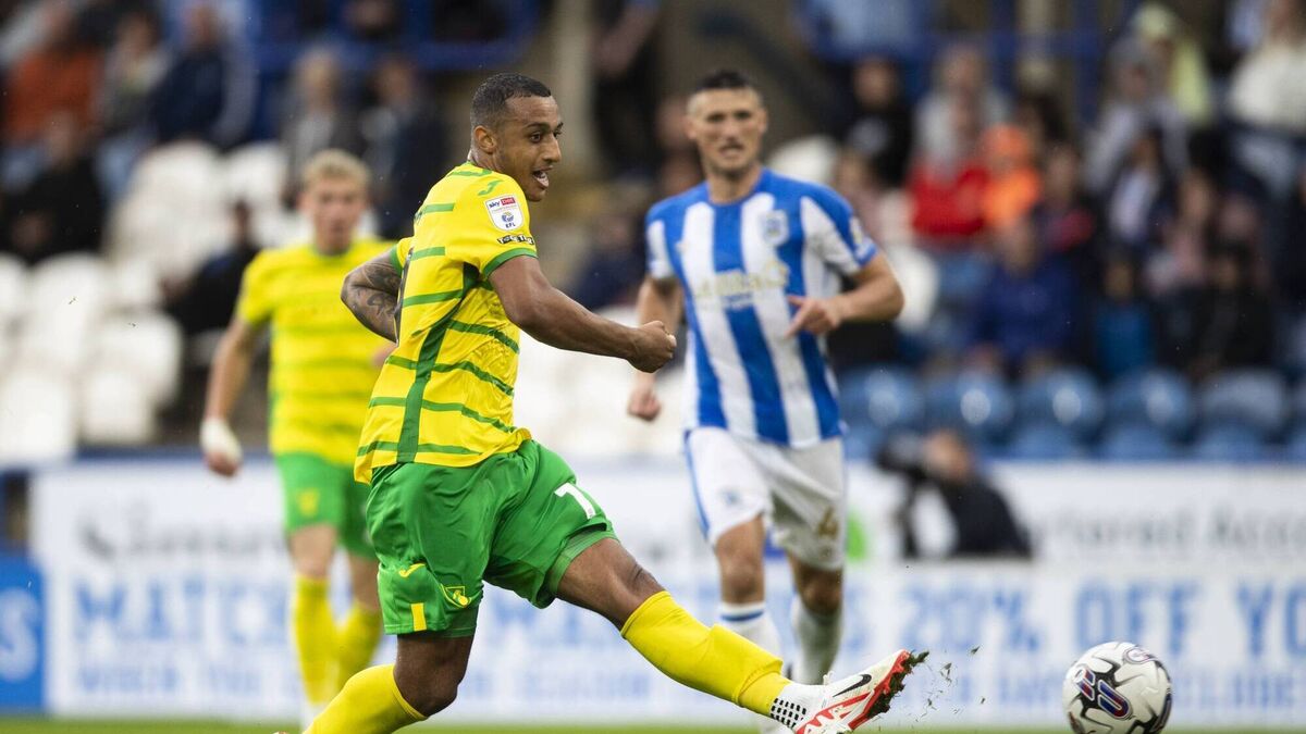 HUDDERSFIELD, ENGLAND - AUGUST 26: Adam Idah of Norwich City scores their side's fourth goal during the Sky Bet Championship match between Huddersfield Town and Norwich City at John Smith's Stadium on August 26, 2023 in Huddersfield, England. (Photo by Jess Hornby/Getty Images)
