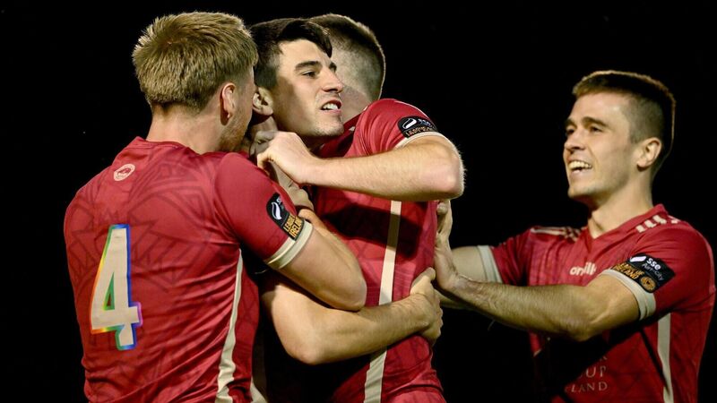 CRUISING: Rob Manley of Galway United celebrates with teammates after scoring their third goal of the night. Pic: Ben McShane/Sportsfile