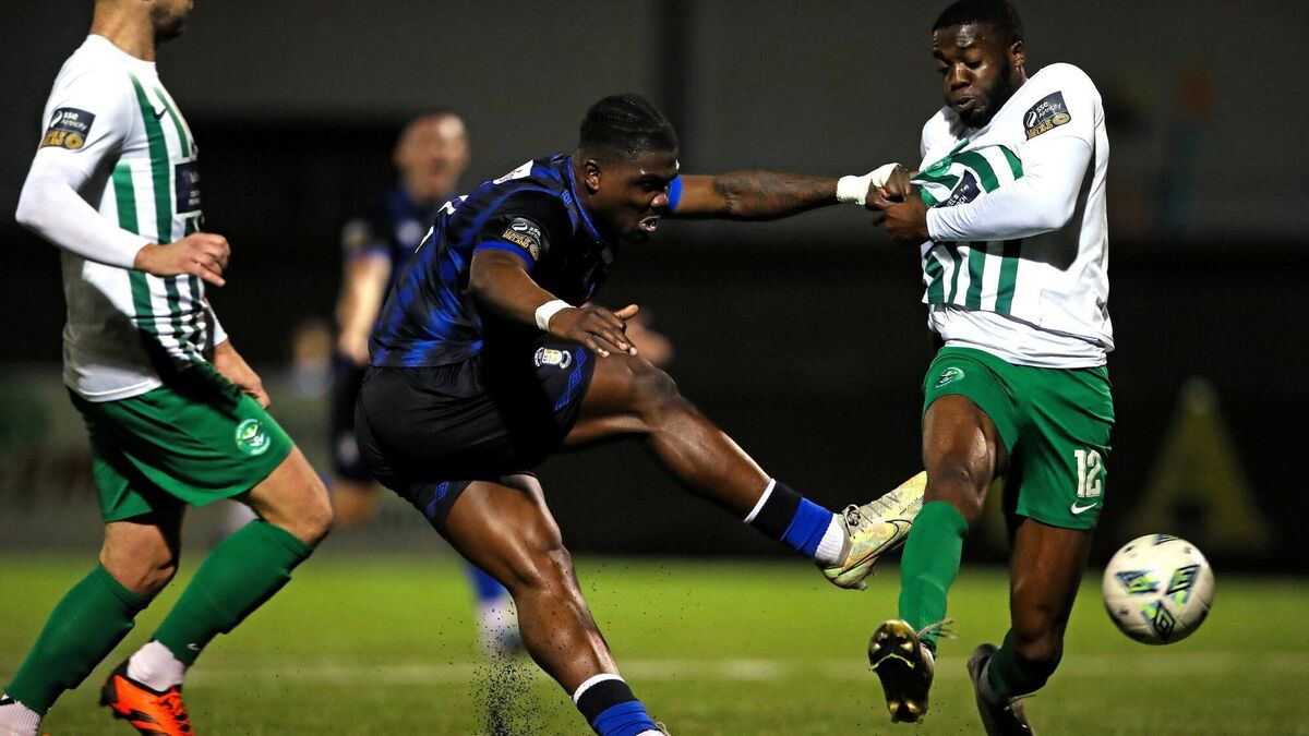 BATTLE: Frantz Pierrot of Athlone Town has a shot on goal despite the attention of Cole Omorehiomwan of Bray Wanderers during the SSE Airtricity Men's First Division match at Athlone Town Stadium. Pic: Michael P Ryan/Sportsfile