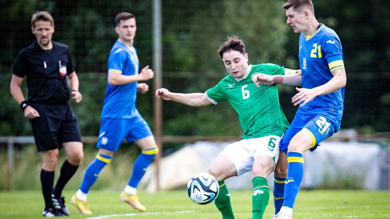Joe Hodge of Republic of Ireland in action against Artem Bondarenko of Ukraine during the U21 International friendly. Pic: Blaz Weindorfer/Sportsfile