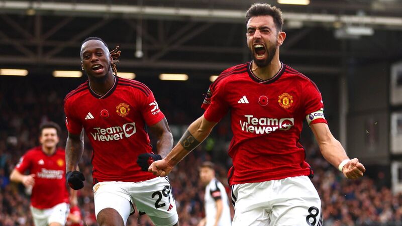 LONDON, ENGLAND - NOVEMBER 04: Bruno Fernandes of Manchester United celebrates after scoring the team's first goal during the Premier League match between Fulham FC and Manchester United at Craven Cottage on November 04, 2023 in London, England. (Photo by Bryn Lennon/Getty Images)