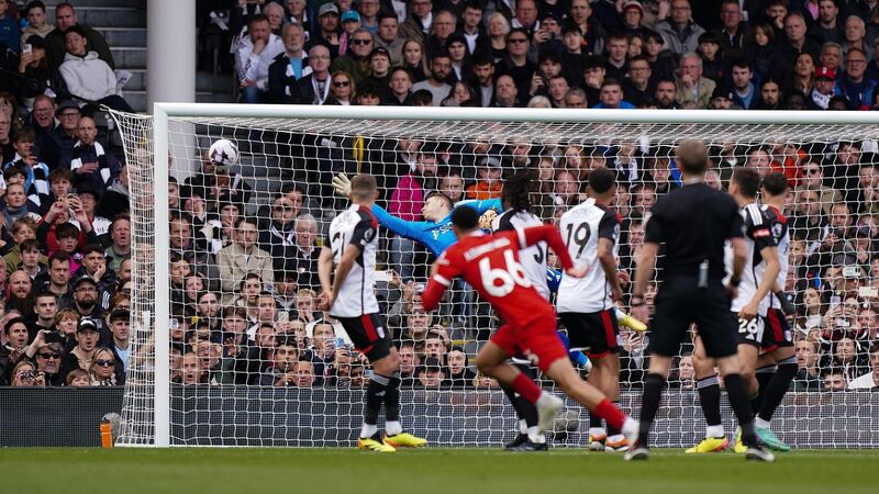 Liverpool's Trent Alexander-Arnold scores their side's first goal of the game during the Premier League match at Craven Cottage. Photo credit: Zac Goodwin/PA Wire.