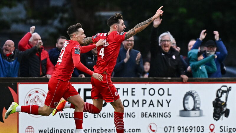 LATE WINNER: Ellis Chapman of Sligo Rovers celebrates with teammate Kailin Barlow after scoring the winning goal for Sligo. Pic: Harry Murphy/Sportsfile