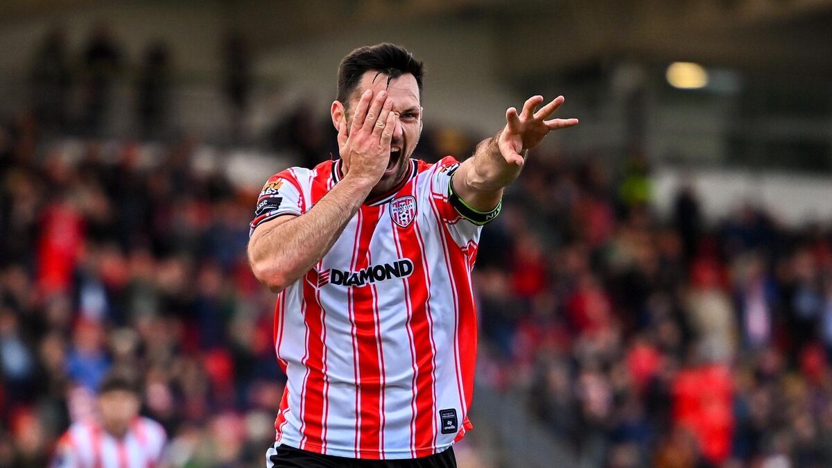 Pat Hoban of Derry City celebrates after scoring his side's fourth goal during the SSE Airtricity Men's Premier Division match between Derry City and Drogheda United. Pic: Ben McShane/Sportsfile