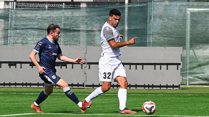 ROCK AND A HARD PLACCE: Kevagn Ronco of FCB Magpies under pressure from Derry City's Paul McMullan at Europa Point Stadium in Gibraltar. Picture: Marcos Moreno/Sportsfile