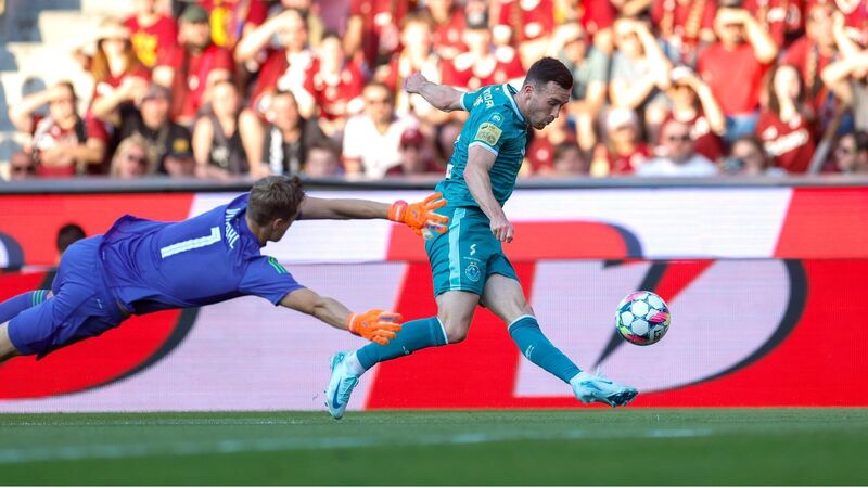 AT THE DOUBLE: Aaron Greene scores the first of his two goals. Pic: Pavel Lebeda/Sportsfile