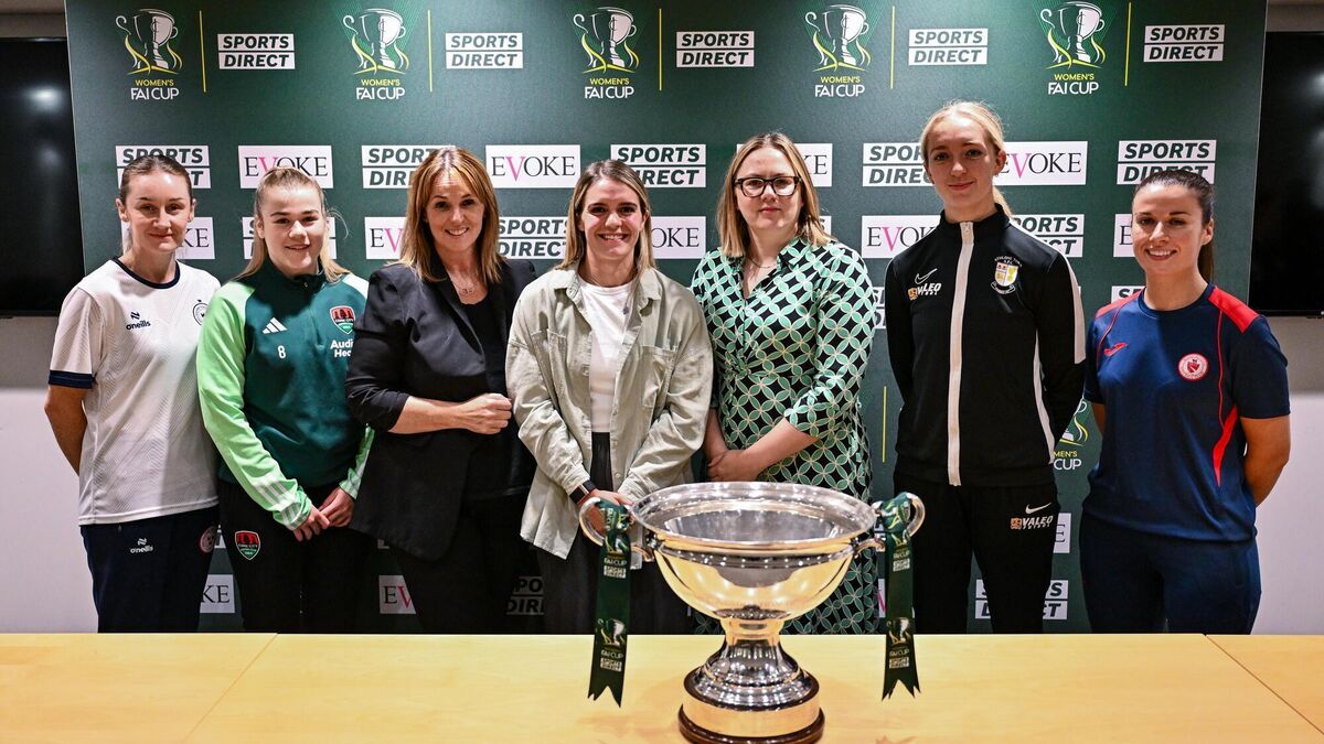 FINAL FOUR: From left, Rachel Graham of Shelbourne, Orlaith O'Mahony of Cork City, Sharon Lancaster, Marketing Manager, Frasers Group, on behalf of Sports Direct, Republic of Ireland international Jamie Finn, Ciara Murray, Head of Marketing, Sports Direct, Katie Keane of Athlone Town and Eimear Lafferty of Sligo Rovers after the Sports Direct Women's FAI Cup semi-final draw. Pic: Ben McShane/Sportsfile