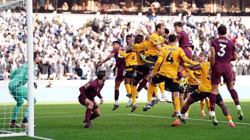 THE WINNER: Manchester City's John Stones scores their side's second goal of the game during the Premier League match at Molineux Stadium, Wolverhampton. Pic: David Davies/PA Wire.