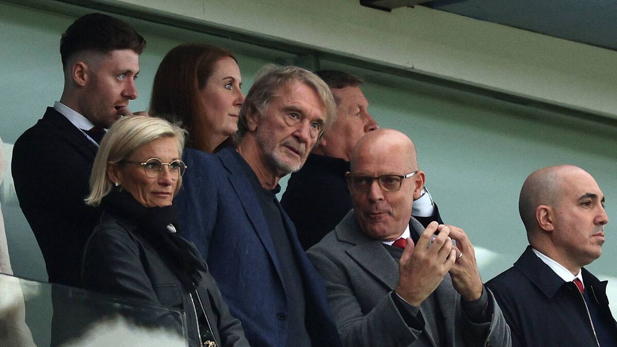 Manchester United's co-owner Jim Ratcliffe (4L) talks with David Brailsford (2R) during the English Premier League football match between Aston Villa and Manchester United at Villa Park (Photo by ADRIAN DENNIS/AFP via Getty Images)