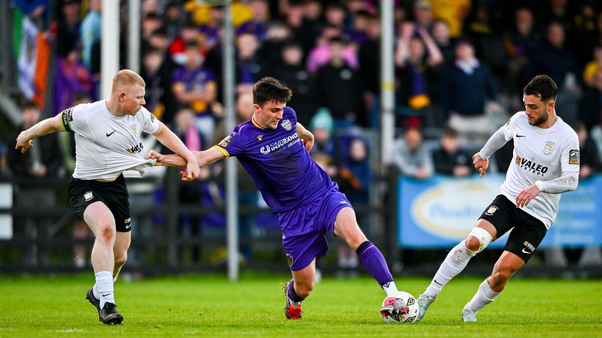 PROGRESS: Darragh Levingston of Wexford in action against Aaron Connolly, left, and Leo Gaxha of Athlone Town during the SSE Airtricity First Division play-off semi-final second leg. Picture: Shauna Clinton/Sportsfile